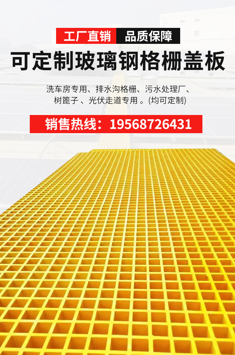 玻璃钢格栅可用于多种场景,例如,光伏走道,树篦子,养殖场,海上平台,污水处理厂,洗车房,工厂等,具有承重力强,防腐阻燃,使用寿命长等多种优点。