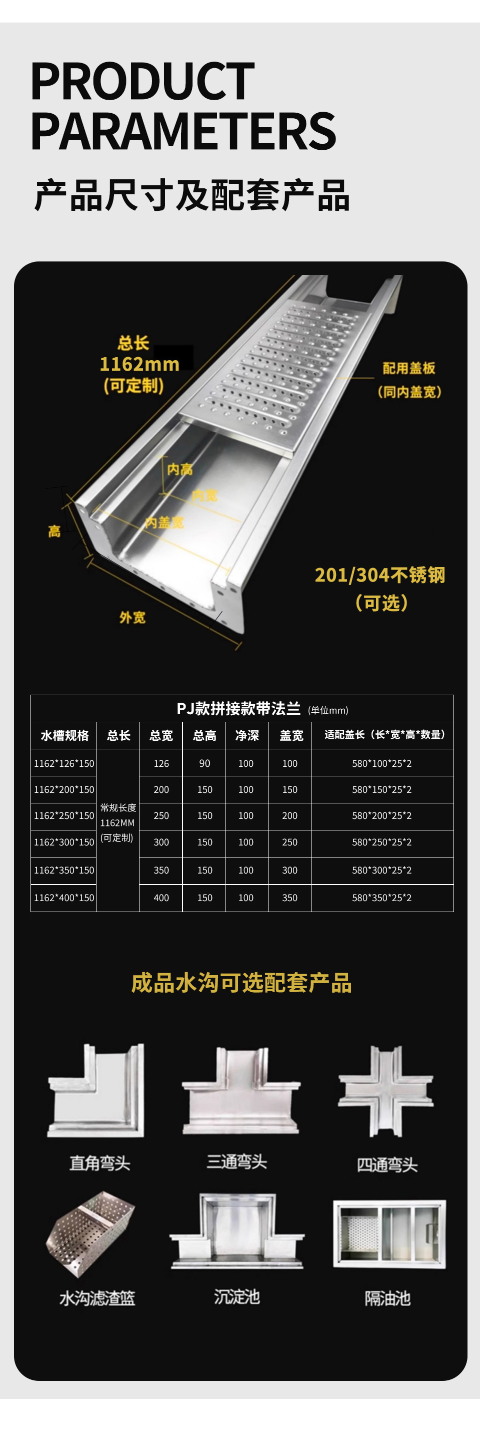不锈钢成品排水沟,免焊接,拼接组装,螺丝加固拧紧,进出水口,可连接
